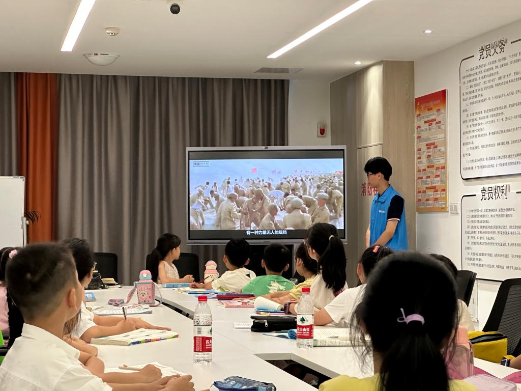 授课之余,实践队成员们积极传达红色使命。7月8日下午,实践队对接台州学院星青年志愿宣讲团,为孩子们带去了“两弹一星”的知识;7月12日下午,实践队成员组织孩子们进行红色观影暨观后感分享活动,意在赓续红色血脉。先辈们为了民族的独立和人民的幸福,用鲜血和汗水灌注了中华大地,他们的英勇事迹使孩子们为之震撼、为之动容。