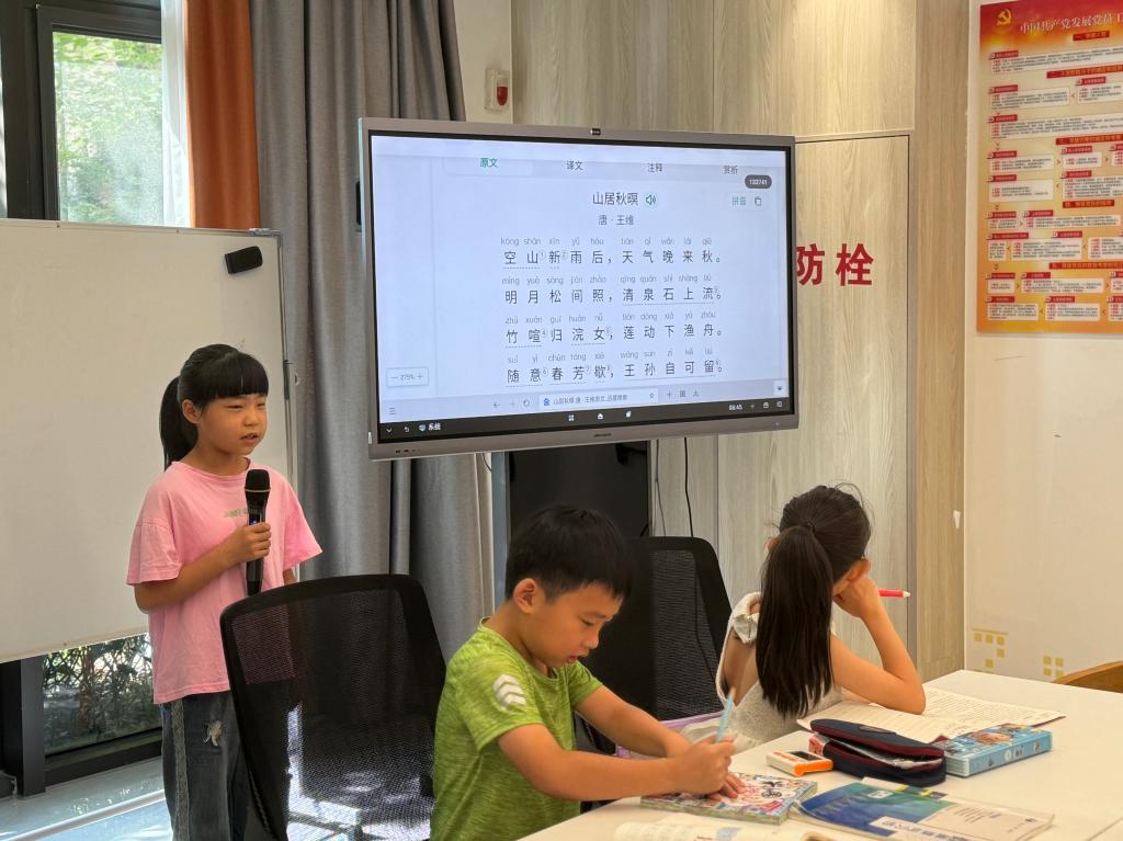 针对每天不同的课程内容,实践队成员结合学生实际情况积极备课,安排了许多课堂互动,不断向着知行合一靠近。比如,实践队成员们贴心设置了每日晨读环节,提前挑选并熟悉经典诗词篇目,为孩子们讲解,鼓励他们放声朗读。