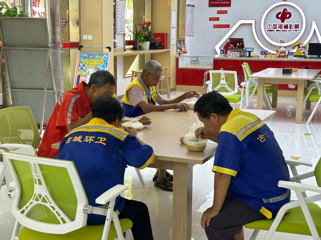 除了每周四固定的爱心早餐活动,助联体还准备了草糊和绿豆汤等清凉解暑的饮品供往来行人享用。助联体每日的长期开放不仅方便了附近作业的环卫工人,也为周边的居民们提供了夏日休闲的空间。
