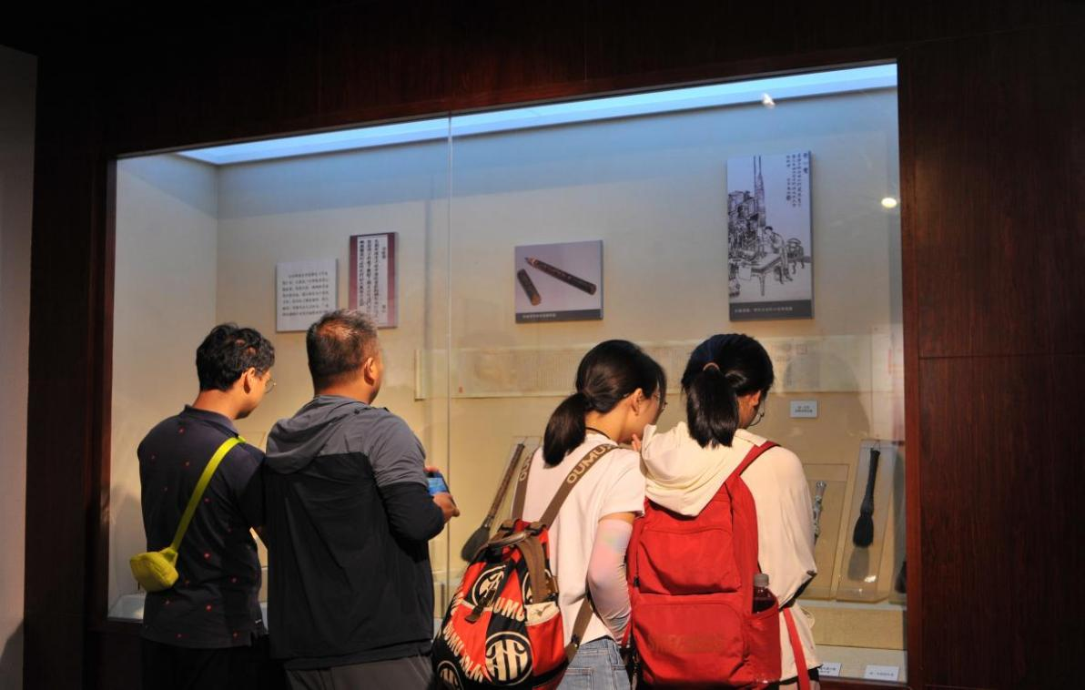 实践队的首站是中国湖笔博物馆。博物馆由主楼和附楼组成,主楼为陈列大厅,共二层,主要用于展示湖笔的历史、文化、制作工艺等内容。附楼则包括接待室、馆长室、湖笔销售厅等,为游客提供服务和购买湖笔产品的便利。来到主楼,从战国毛笔到现代湖笔的历朝湖笔文物200余件陈列其中。得益于各种动物毛发(如兔毛、羊毫、狼毫等)的硬、软、弹力差异,这些特性相互融合,湖笔为书写者提供了丰富的表现力。此外,湖笔的制作过程极为复杂,包括水盆、结头、车斗、择笔、刻字等大流程和众多小流程,每一步都需要制作者的极致耐心与精湛技艺。特别是在“水盆”这一关键步骤中,在对制作者的操作姿势有严格的规范之外,还要求在特制的水盆中精挑细选,从万千毫毛中萃取出最佳原料。其独特的“湖颖”技艺,使得湖笔品质卓越,甲冠天下,造就“三义(精、纯、美)四德(尖、齐、圆、健)”的优良品性。