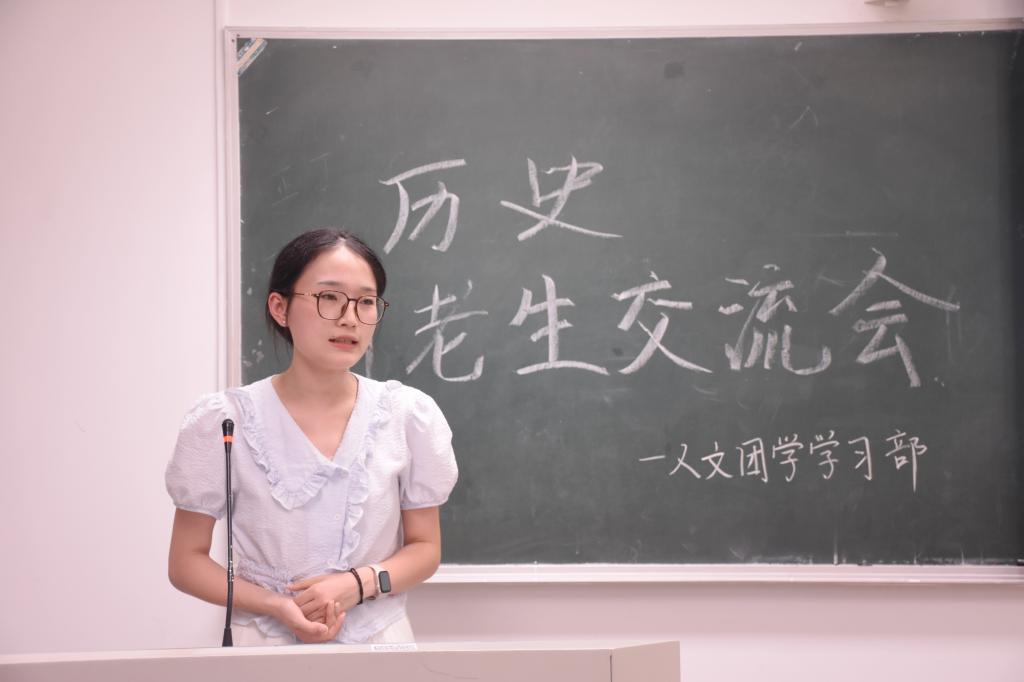 在经验分享环节中,池秀秀鼓励同学们去创造更多的体验。她指出,步入大学篇章,需要同学们不断去摸索学习,勇于追求,敢于试错,并积极培养兴趣特长,参与社团活动,也可以投身志愿活动,积累社会经验。杨子吟重点向大家介绍了有关历史学习的内容,从学业成绩、集中实践环节、评奖评优三个方面向大家阐述了多方面综合发展的重要性,鼓励同学们进行大量历史书籍的阅读,并提高对于体测和奖学金的重视程度。陈星颖则分享了一些学生会工作的心得,以自身经验为例,围绕态度、平衡和收获三个关键词,启示同学们可以平衡工作、学习和生活,学会肯定自我价值,在每一次踏实的工作中收获经验和成就感。