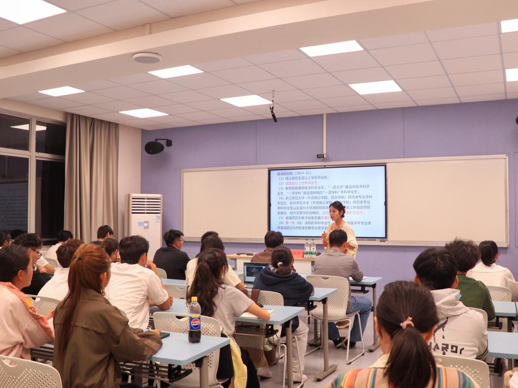 活动伊始,赵娅玲学姐讲述了自己的大学生活和在北师大台州实验学校工作的经历。从因高考差一分与梦想的中教专业失之交臂,到刻苦学习以专业排名第四进入中教三台班,她结合这段经历让同学们深切体会到了目标与执行力的意义所在。此外,赵娅玲详细分享了自己的考编经历和心得,让大家意识到好资源、信息差以及自身成长对于考编大有裨益。同时,赵娅玲强调了奖学金、体测和参与各类比赛的重要性。