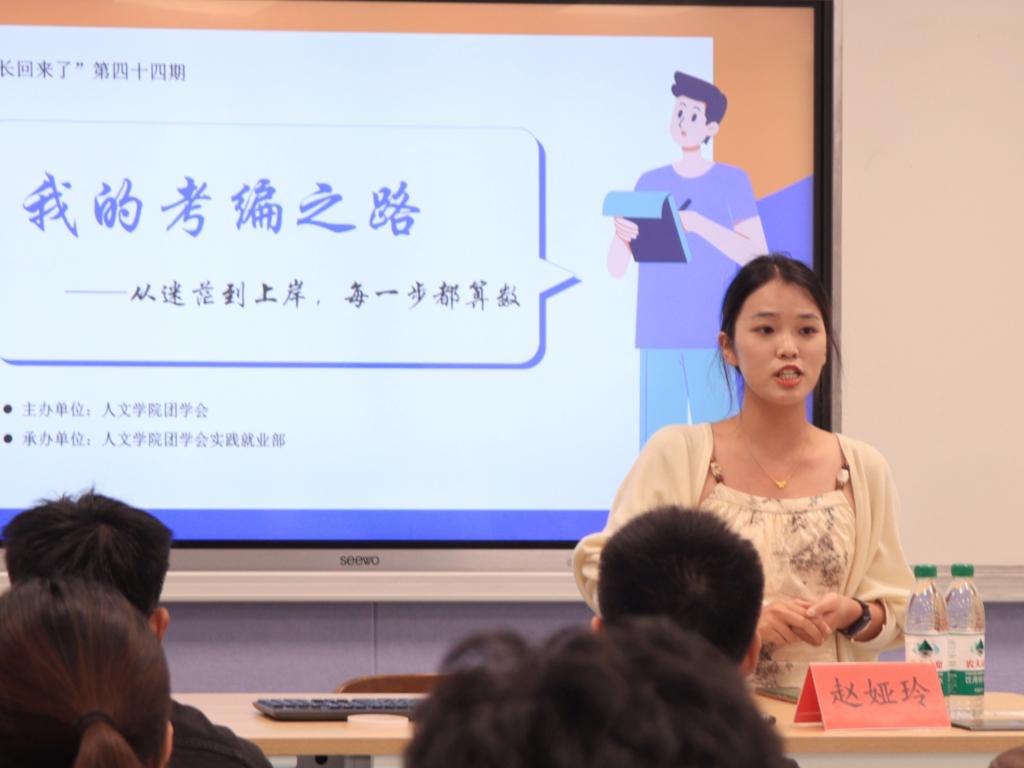 紧接着,赵娅玲分享了面试时的各类技巧、考编的准备工作以及心态调整方法,使同学们对于考编这条路有了新的认识。最后,她以“人生没有白走的路,每一步都算数”一语结束了分享,并寄语同学们可以勤学苦练,多去尝试。