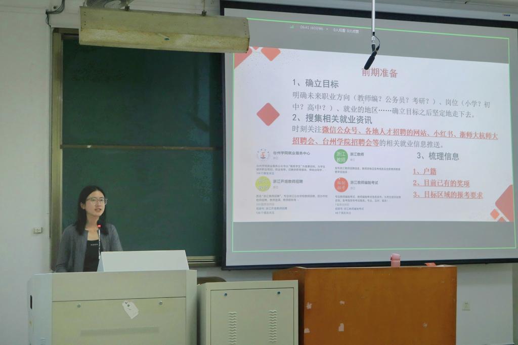 卢柳辰现任宁波海曙第三外国语中学的初中语文老师。她表示,明确未来职业方向、搜索相关就业资讯、梳理信息以及制订计划,有助于做好前期准备。紧接着,卢柳辰还热心地推荐了考教师编的相关教材,着重强调在准备结构化面试中要形成适合自己的一套模板,并就备考选择报班还是自学做出了利弊分析。此外,卢柳辰结合自身经历提出了几点建议,分享了上岸后的教师生活,鼓励同学们多去尝试,勇于抓住机会。