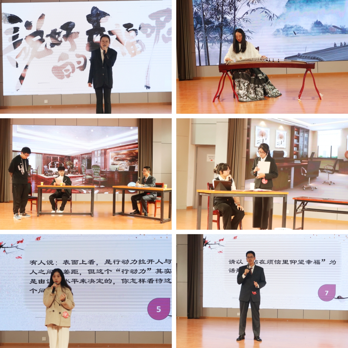 本次活动分为“秀出自我”“秘书技能”“即兴演讲”“老师点评”“嘉宾表演”“荣耀时刻”六个部分。活动伊始,九位选手通过诗朗诵、歌舞表演、脱口秀、古筝演奏等方式展现自身才能,为现场的观众带来了一场视听盛宴。在“秘书技能”环节,各位选手针对职场中可能出现的突发情况展开模拟演绎,如“怎样应对经理外出时宾客的突然到访”“怎样与客户沟通”等,充分展现了选手的表达沟通能力与实践能力。在“即兴演讲”环节中,选手们依据所抽取的题目,结合生活经历,引经据典,妙语连珠,流畅地阐述了自己的见解,引来在场观众的赞叹。