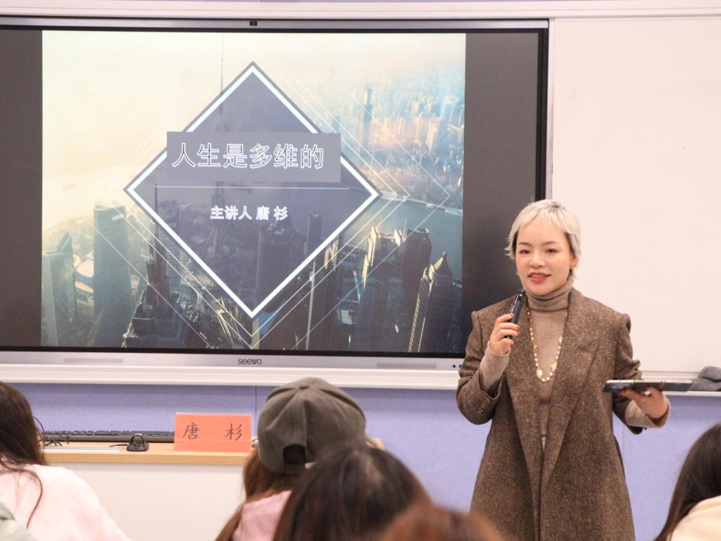 12月7日下午,亚洲成人久久邀请了台州女企业家协会代表、2007届优秀校友唐杉在1105教室作“人生是多维的”主题讲座,为同学们带来了关于人生多维化视角的深刻思考。
