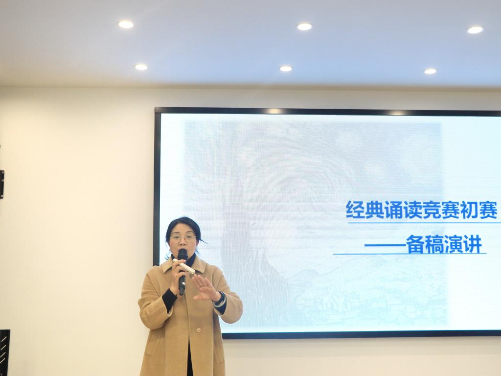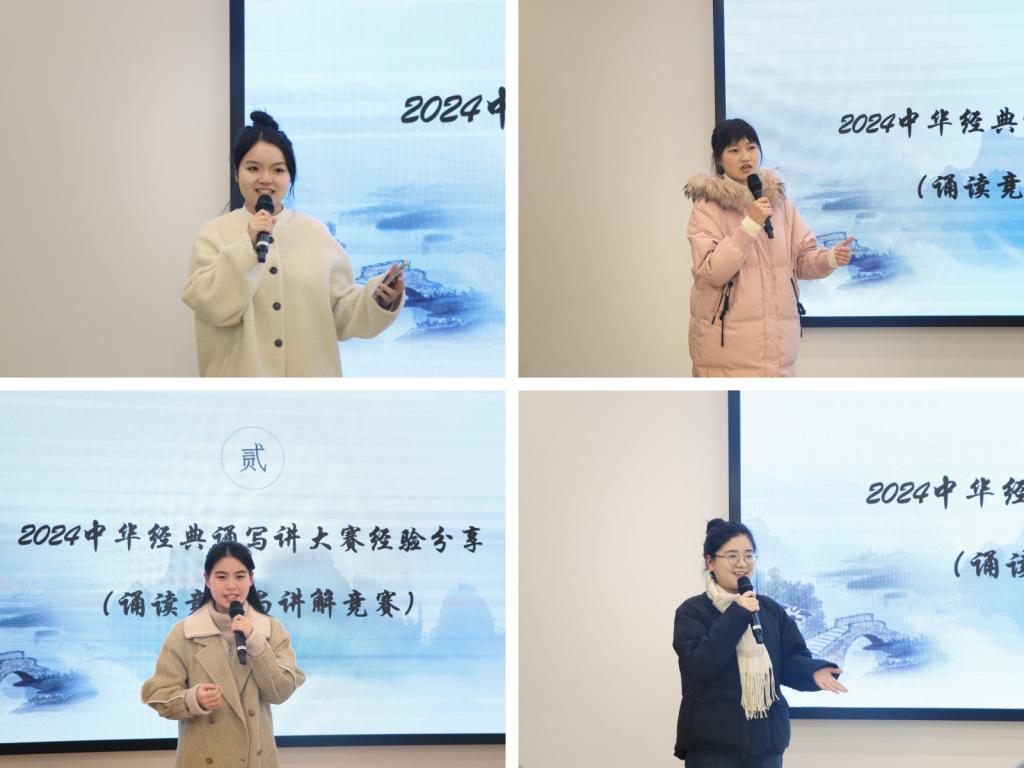 中华经典诵写讲竞赛指导教师金妮娅老师详细介绍竞赛流程,并从有感情、有内容、有结构三个角度提升学生的备稿演讲能力。会中,金妮娅老师向同学们展示了往届选手的优秀作品,并指出要先学会说自己有感觉的话,注重文章的逻辑条理性,强调演讲稿要以情动人,以理服人。程向荣老师强调,同学们在备稿与讲解时应读懂、读透文本,关注诗歌的结构,把握诗人的情感变化与写作风格。王欣老师指出同学们要把握机遇,积极大胆参赛,学会拥抱失败,不给人生留下遗憾。徐旭敏老师则引用了“游戏人生”的概念告诉同学们要以极其投入的态度对待备赛过程,享受过程中的收获,而不以结果为唯一目的。张之羽老师指出演讲稿的书面表达和口语表达存在一定区别,在撰写演讲稿时要有听众意识,讲述的内容要让听众听得懂。