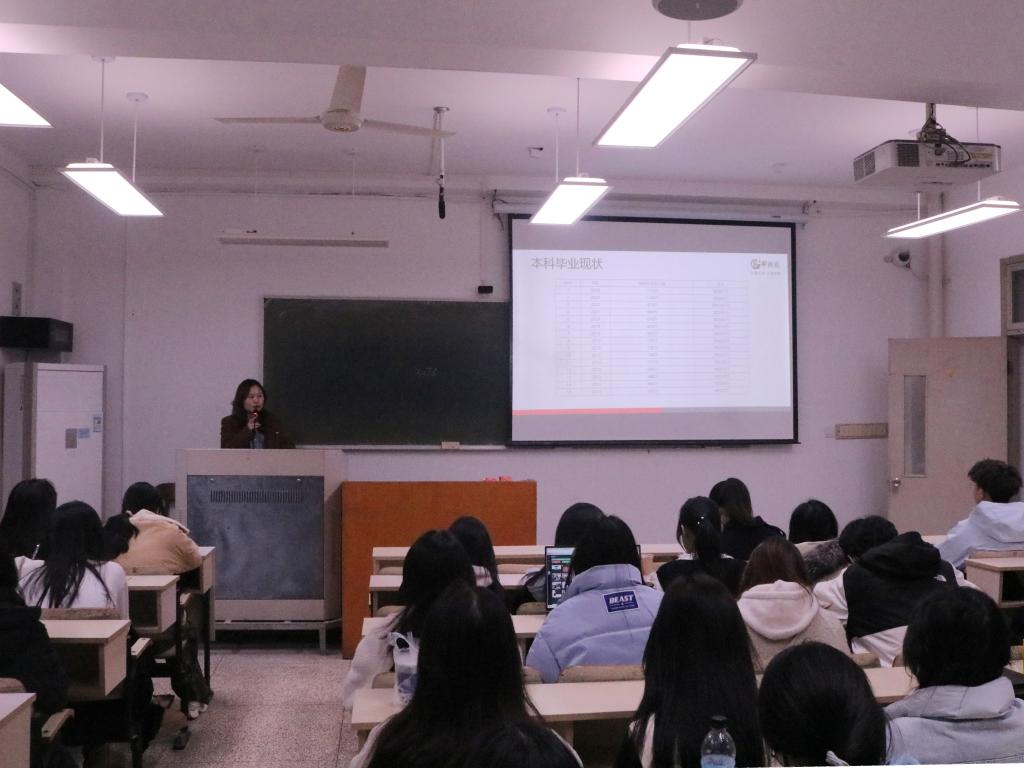 讲座伊始,主讲人赵晋婷首先从当前本科毕业现状入手,指出毕业生即使正处于就业方向多样化发展的情况下,仍然面临着AI替代、应届生冗多、学历学位高要求等困境。她建议,同学们除了学习好本专业知识以加强竞争力之外,还可以通过习得新技能、提升学历等方式来实现“破局”。