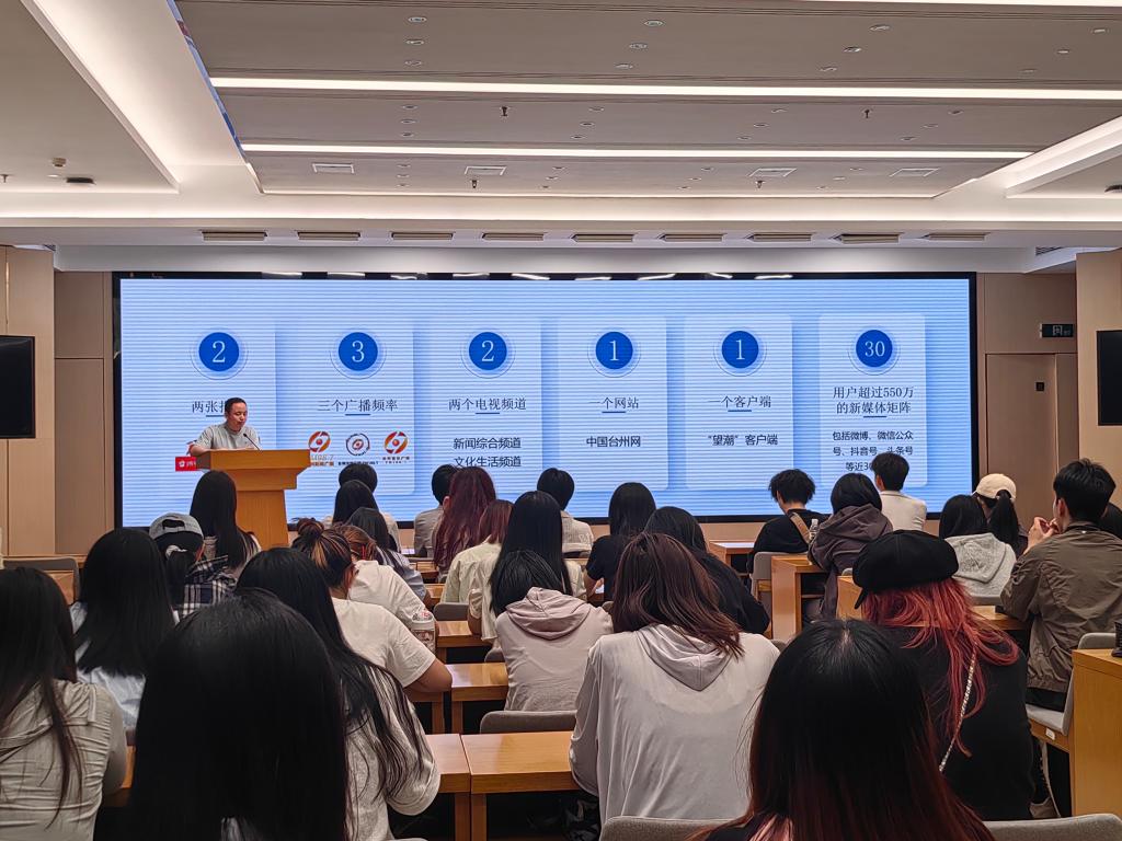 在参观结束后,台州市新闻传媒中心新媒体数字编辑部主任黄元杰为同学们带来了《台州传媒的前世今生》讲座。他剖析了台州传媒发展脉络,并着重介绍了“望潮”客户端,强调其集“报纸+广播+电视+新媒体”于一体,展现出了航母式集群作战的强大优势,是台州传媒融合发展的生动实践。此外,他还阐述了“六大融创行动”,如产业突破、AI开启行动等,揭示了台州传媒在创新驱动下不断进取,积极探索新发展路径的决心与实践,为同学们勾勒出一幅台州传媒与时俱进、蓬勃发展的壮丽图景。