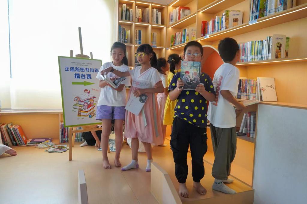 细辨图书真伪,练就火眼金睛。在实践队员讲解完盗版图书的各方面特征后,“正盗版图书辨别赛”火热启动。孩子们纷纷行动起来,穿梭在书架间仔细搜寻。他们熟练运用所学,认真查看图书的印刷质量、出版社信息等,精准锁定存在问题的图书。不少孩子手持盗版图书,与同伴交流心得,辨别能力与版权保护意识在实践中显著提升。