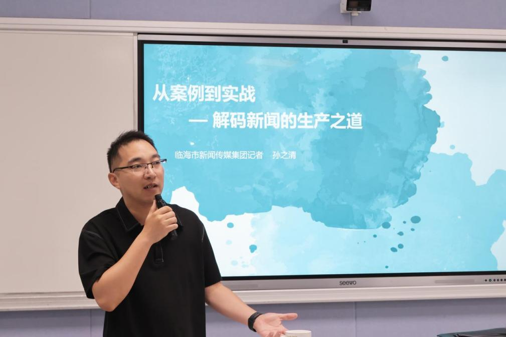 一方面,孙之清结合9月1日至6日的新闻案例,详细拆解新闻生产流程,深入讲解报题审批、新闻播出及采制细节。以9月1日全市中小学开学报道为例,介绍单位派六路记者采访、选刚入学小学生契合主题、用空镜头解决儿童表达问题、多角度拍摄提升新闻完整性与感染力的做法;针对专业性报道,提出以小切口切入深挖价值;以新任临海市市委书记调研报道为例,说明时政新闻需精准捕捉核心信息。同时还分析了其他类型新闻稿件,让同学们受益良多。