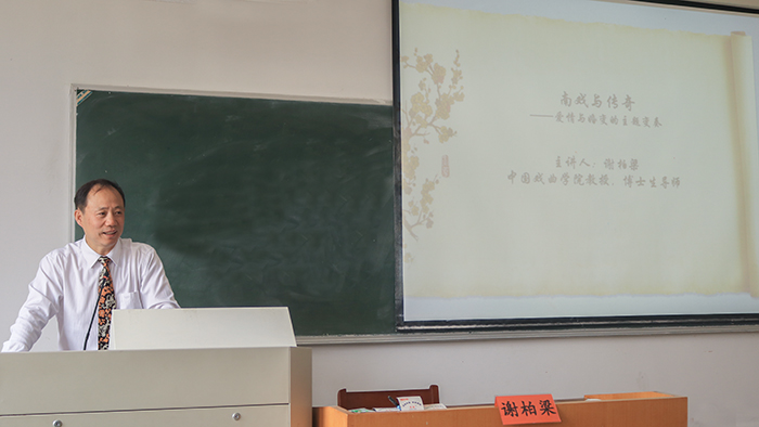 讲座以《张协状元》《琵琶记》《牡丹亭》《长生殿》的文本解读为基础,重点分析南戏与传奇爱情和婚变主题的嬗变及其文化内涵。从科举文化、主体不自由、思想解放、平等爱情等方面揭示南戏到传奇的爱情和婚变演变的轨迹及其动因。谢教授以富有启发性、生动形象的语言,把许多问题解读、描绘的细致入微,如从为什么宋代重用文人,文人的优缺点,男人富贵之后所经常展现的人性弱点,进而说明南戏婚变题材较多的原因;还有对张协刀砍贫女的描述,蔡伯喈拜祭父母坟墓之后矛盾心态的解读等,都给听众留下了深刻影响。