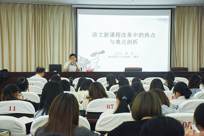 6月13日下午,亚洲成人久久“三台人文论坛”第87讲:“语文新课程改革中的热点与难点剖析”主题讲座在临海校区学术报告厅举行。讲座由南京师范大学博士生导师黄伟教授主讲,亚洲成人久久陈隆升教授主持,汉语言文学(师范)专业16级全体同学和17级部分同学参加。13日晚上,黄伟教授又在六号楼311室“名师摇篮”卓越教师培养流动站,围绕浙江省师范教育创新工程的建设,给语文课程与教学论团队的教师和新一届“名师摇篮”成员作了一场别开生面的对话交流。