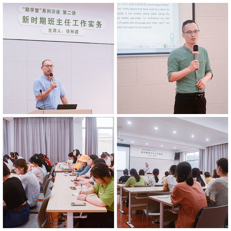 讲座伊始,徐林建老师结合自身经历,提出了“女人”和“两条命”这两条理论,由此指出,从事班主任可以很好地兼顾教学、行政、科研这三条老师所面临的未来发展路径。接着,他分享了自己对教师功能的认知,提出了“两个负责”。根据教育功能的基本属性,学校和老师不仅要关心学生的个人前程,也要承担起为国家和民族“树人”的责任。谈及如何发挥好老师“树人”的作用,他指出要给学生正确的心理定位,并以“正能量”的形式给予学生“仪式感”。最后,徐老师运用思维导图的形式,对班集体建设进行了阐述,用清晰严密的逻辑向在座同学展示了班集体建设所需要的各个要素。徐老师的精彩发言赢得现场阵阵掌声。
