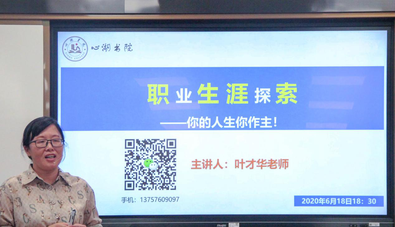 为了帮助书院学子了解职业规划的重要性,更好地进行自我认知,对未来的职业生涯有一个明确系统的规划,6月18日晚,心湖书院在椒江校区4号教学楼智慧教室举办第三期心湖讲坛。活动邀请商学院叶才华老师作题为“职业生生涯探索----你的未来你做主”主题讲座。心湖书院副院长刘贵花主持讲座,辅导员姚卓琳及书院全体学生参加聆听。