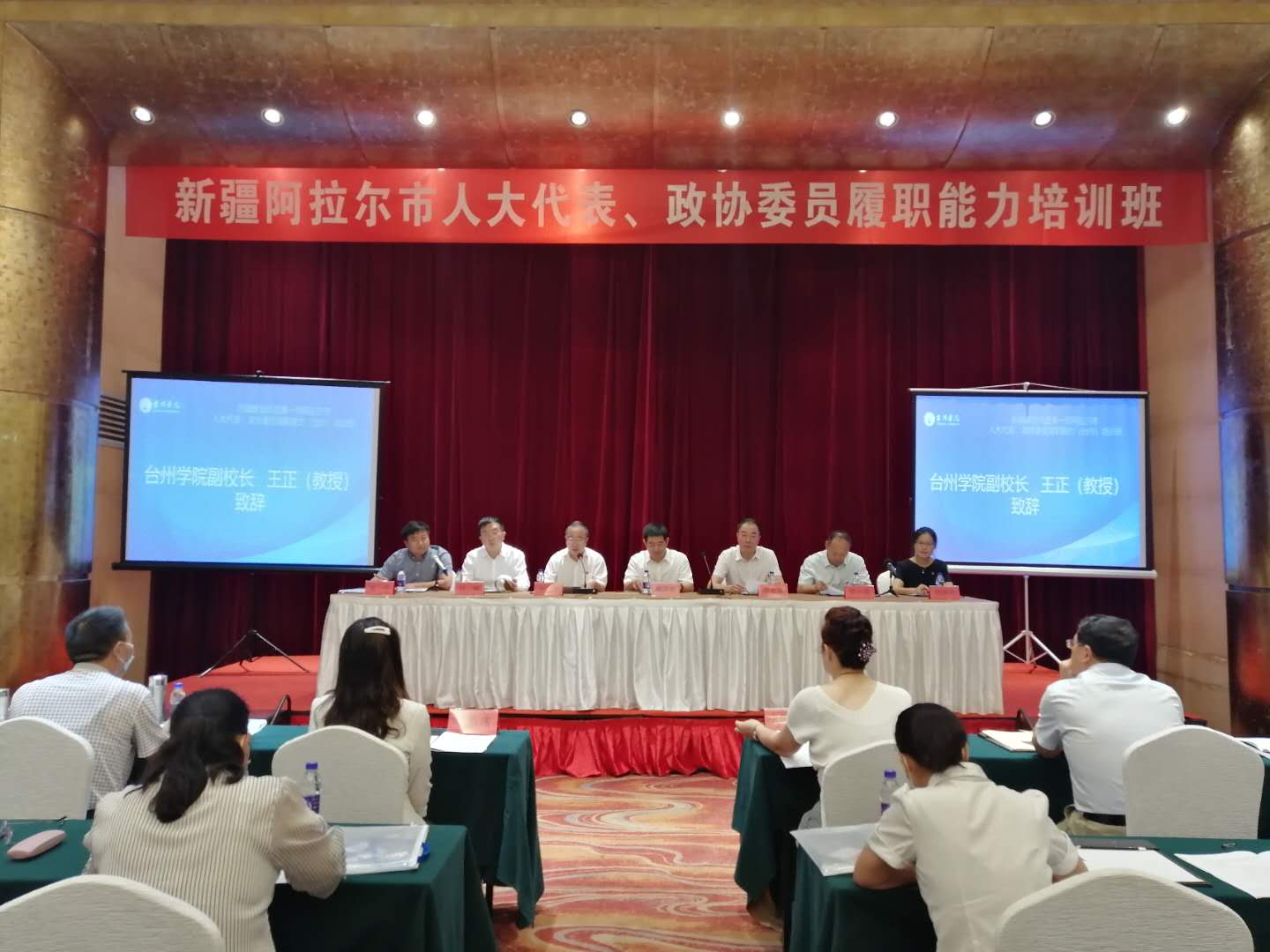 9月17日上午9:00,由台州学院亚洲成人久久承办的新疆生产建设兵团第一师阿拉尔市人大代表、政协委员履职能力(台州)培训班在台州市椒江区花园山庄顺利开班。台州学院副校长王正教授在开班仪式上致辞,亚洲成人久久党总支书记郑丽君同志出席开班仪式,亚洲成人久久副院长高平教授主持开班仪式。