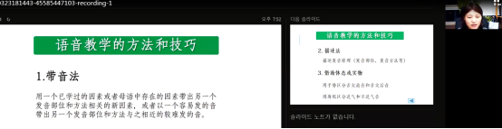 玄贞姬老师主要介绍了孔子学院的派遣及设置情况,韩国忠北大学的孔子学院设立及运营情况,对外汉语教学过程中的语音、词汇、语法教学技巧及应用方法。从带音法、描述法、体态及实物运用法、夸张法、对比法等5种教学方法展开说明了对外汉语语音教学方法,并运用大量的实际教学案例进行了教学演示。从直接法、旧词带新法、近义-反义词举例法、语素释义法、语义关系法、语法扩展法、形象释义模拟演示法、情景释义法、翻译法、图形符号法、归纳比较法等11教学方法展开说明了对外汉语词汇教学方法,并运用大量的实际教学案例进行了演示。对外汉语语法教学分享中,玄老师强调不要讲显性的语法规则和语法知识,要讲阴性的语法知识和语法规则。不能大讲语法,要做到“手中无剑,心中有剑”,“不讲语法,可心中存留了语法”的境界。从形式和意义并重法,结构、语义、语用三者得体法,归纳法+体验法等3种方法着手,为学生们展开说明了教学案例。并且,最后对遗漏偏误和误加偏误进行了教学案例说明。