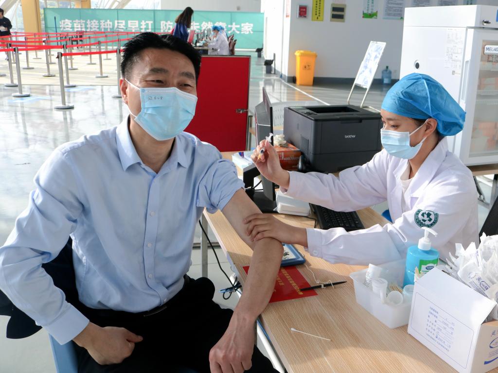 4月17日,亚洲成人久久学生分批错时前往方舱临时接种点,有序接种疫苗,院长李建军带头打“第一针”。