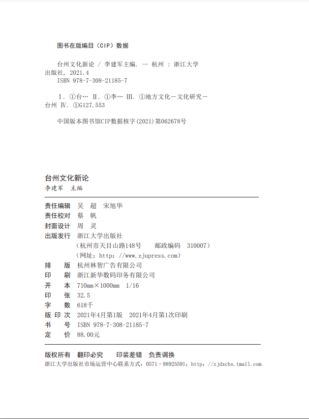 特别需要指出的是,《台州文化新论》的“新”不是追求标新立异的“新”,而是崇尚守正出新的“新”。我们力图恪守文献考据、文本细读、文史互证等优良学术传统,遵循辨章学术、考镜源流等正统学术路径,走正路、阐新意。我们力图吸收学界最新成果,全面梳理台州文化的区域背景、演进历程,系统分析台州文化的辉煌成就、独特价值,细致探讨台州文化的主要类型、基本精神,综合把握台州文化的境外传播、未来发展,编撰一本雅俗共赏、守正出新的台州文化新著。我们力图融会贯通、自出机杼,但因书成众手、各具面貌,尽管笔者最后统稿时做了相当程度的删削、修正、校补,书稿仍有不少瑕疵、留有不少缺憾。庆幸的是,浙江大学出版社的资深编辑宋旭华老师非常专业、非常敬业,对书稿进行了极为精细的审读,发现并纠正了书稿中不少讹误,切实帮助书稿减少了失误、提高了质量。