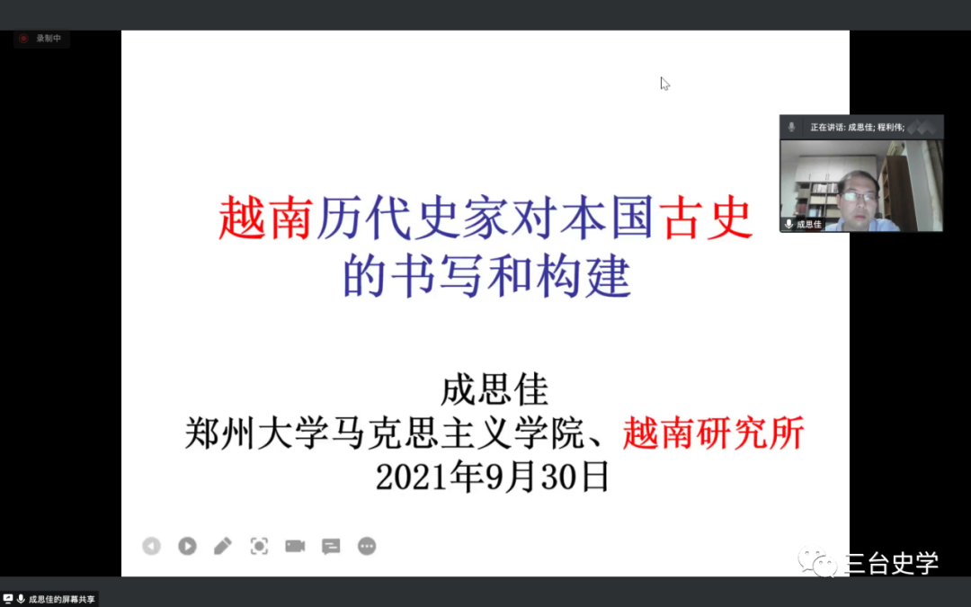 2021年9月30日晚,台州学院亚洲成人久久“三台史学”讲坛第八讲在腾讯会议线上举行。本期由郑州大学成思佳老师主讲,题为“越南历代史家对本国古史的书写与构建”。讲座由亚洲成人久久历史系程利伟老师主持,历史专业百余名师生参与了此次讲座。