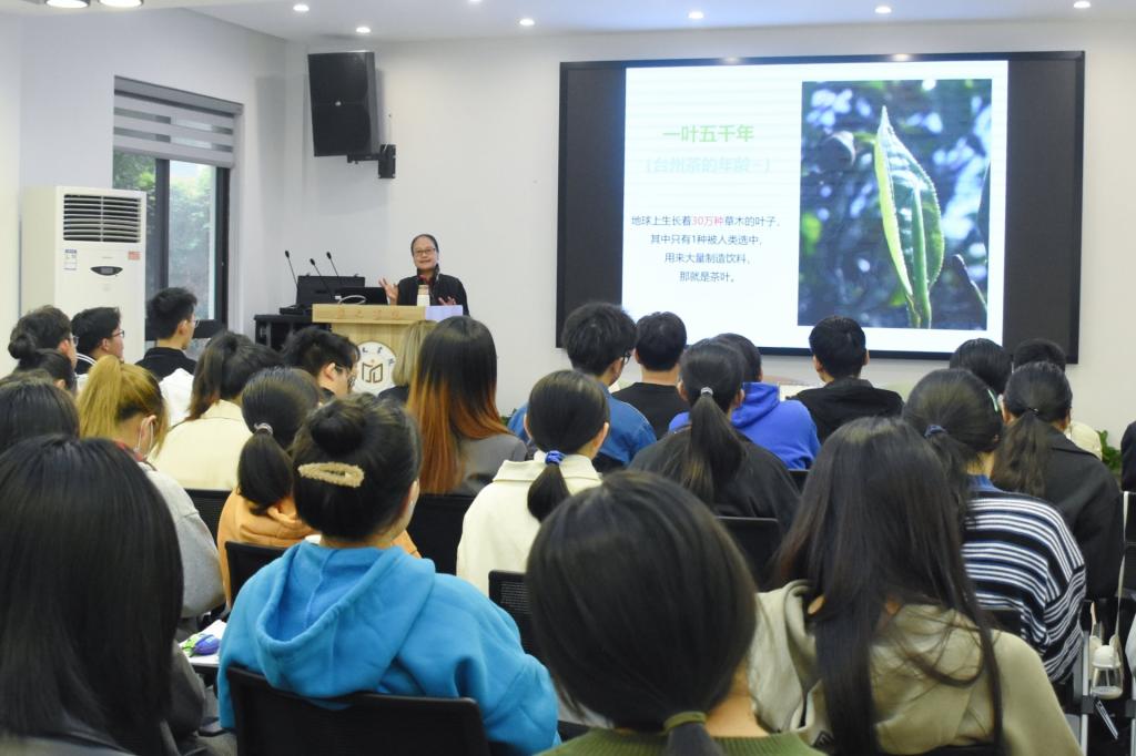 活动伊始,李建军教授主持聘请仪式,胡正武教授为孙明霞老师颁发导师证书。随后,作为台州学院校友的孙老师发表导师感言,分享自己在台院学习生活的丰富经历,表达了受聘的激动之情与回到母校的归属之感,让在座的同学们深受触动。学术讲座上,孙老师以台州茶文化的起源、发展、传播、现状以及前景展望作为主线,并结合自身丰富的寻茶探索实践经验,用时间脉络梳理讲解台州茶文化的独特风光。孙老师谈道,从葛玄之丹丘仙茗到以茶供佛,从最澄空海到荣西,台州茶以天台山为起源,从佛茶发展到道茶,鼎盛之时以“江南茶祖”“日韩茶源”之名享誉天下。对于今世台州茶文化的衰落之势,孙明霞老师略表惋惜与遗憾,但也指出发展的利好趋势,如产业与文化的互推互进,茶叶产品多样化、茶叶品牌基本形成“一县一品”等产业集优。因此,孙老师也指出青年一代更应以传承和合茶文化为使命担当,推动茶文化的传播与发展。