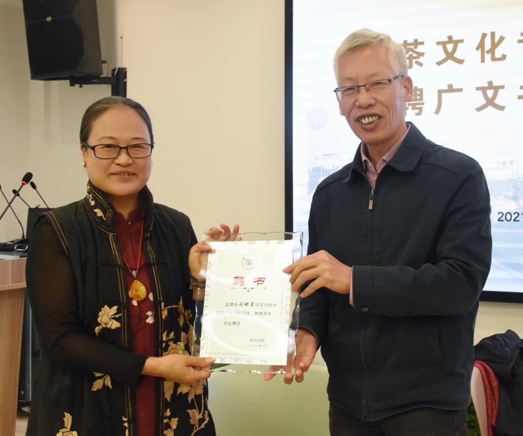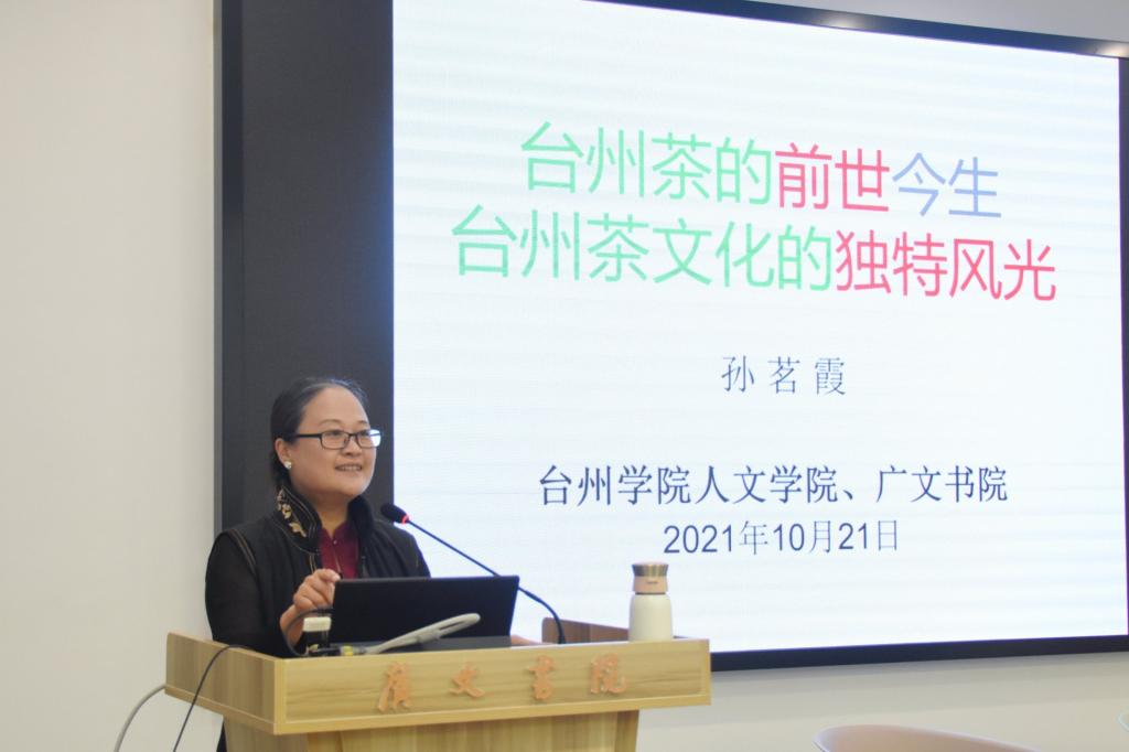 10月21日下午,台州市椒江区政协文化文史和学习委副主任、茶文化促进会副会长兼秘书长孙明霞受聘广文书院校外导师仪式,暨“台州茶文化的独特风光”学术讲座于广文书院学术报告厅召开。亚洲成人久久院长李建军教授、广文书院院长胡正武教授出席,部分亚洲成人久久学生参加活动。