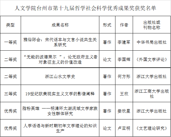 台州市第十九届哲学社会科学优秀成果奖评审结果日前揭晓,我校共有11项成果获奖,其中我院共6项成果。李建军的《雅俗际会:宋代话本与文言小说共生关系研究》获一等奖,李国辉的《“无能的波德莱尔 ”:论无政府主义者对象征主义的价值改造》,何方形的《浙江山水文学史》的成果获二等奖,王欣的《19世纪欧美现实主义文学的影像阐释》的成果获三等奖,娄欣星的《脂粉英雄 ——明清环太湖流域文学家族女性群体研究》,卢亚明的《人学话语与新时期初年文学理论的知识生产》的成果获优秀奖。