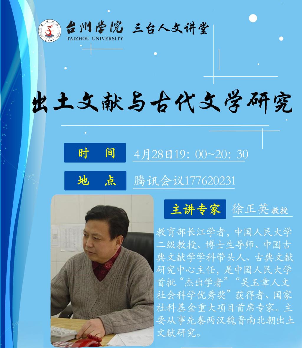 4月28日晚,中国人民大学二级教授、博士生导师徐正英教授应邀作客我院“三台人文论坛”,于线上展开题为“出土文献与古代文学研究”的专题讲座。本次讲座由任红敏教授主持,部分亚洲成人久久教师、学生参加。
