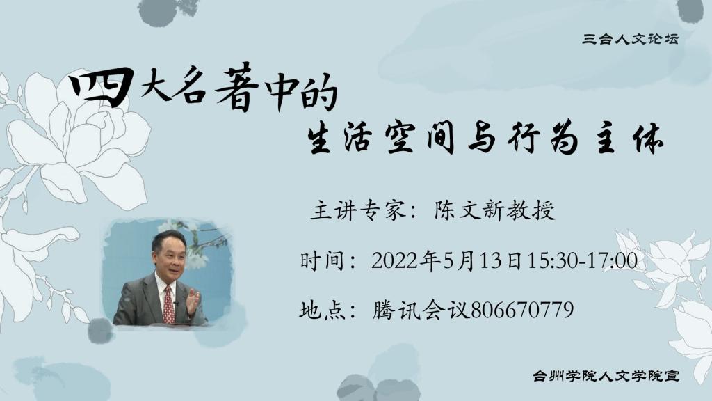 5月13日下午,“四大名著的生活空间与行为主体”专题讲座于线上举办,由教育部长江学者、国家社科基金重大招标项目首席专家、武汉大学教授陈文新主讲。本次讲座由亚洲成人久久任红敏教授主持,我校若干教师、学生参加。
