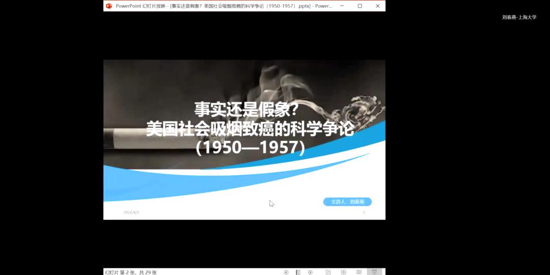 2022年6月5日19:00,台州学院亚洲成人久久“三台史学”讲坛第15期在腾讯会议线上举行。本期由上海大学刘春燕老师主讲,题为“事实还是假象?美国社会吸烟致癌的科学争论(1950—1957)”。讲座由台州学院亚洲成人久久历史学系程利伟老师主持,历史学专业近70名师生参与了此次讲座。讲座伊始,刘老师首先介绍了自己的学术研究旨趣和选题由来,并由美国香烟的品牌、相关轶事、以及万宝路香烟广告和标签内容的转变引出本次讲座的主体。