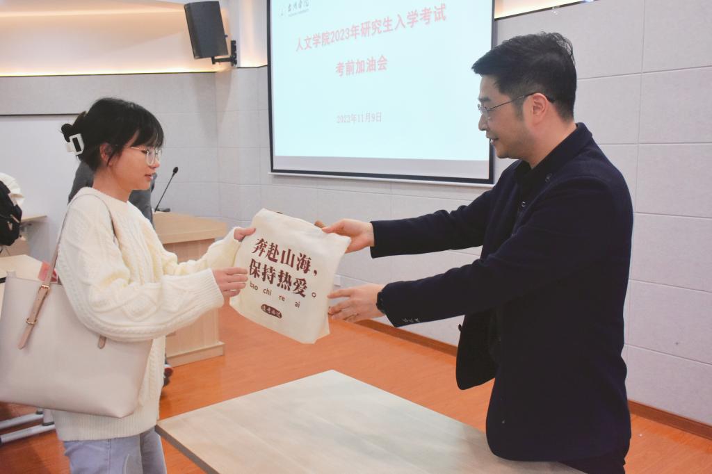 最后,金宏伟书记代表学院全体老师为人文考研学子送上学院精心准备的考研加油包,并预祝同学们都能一战成硕,梦想成真。