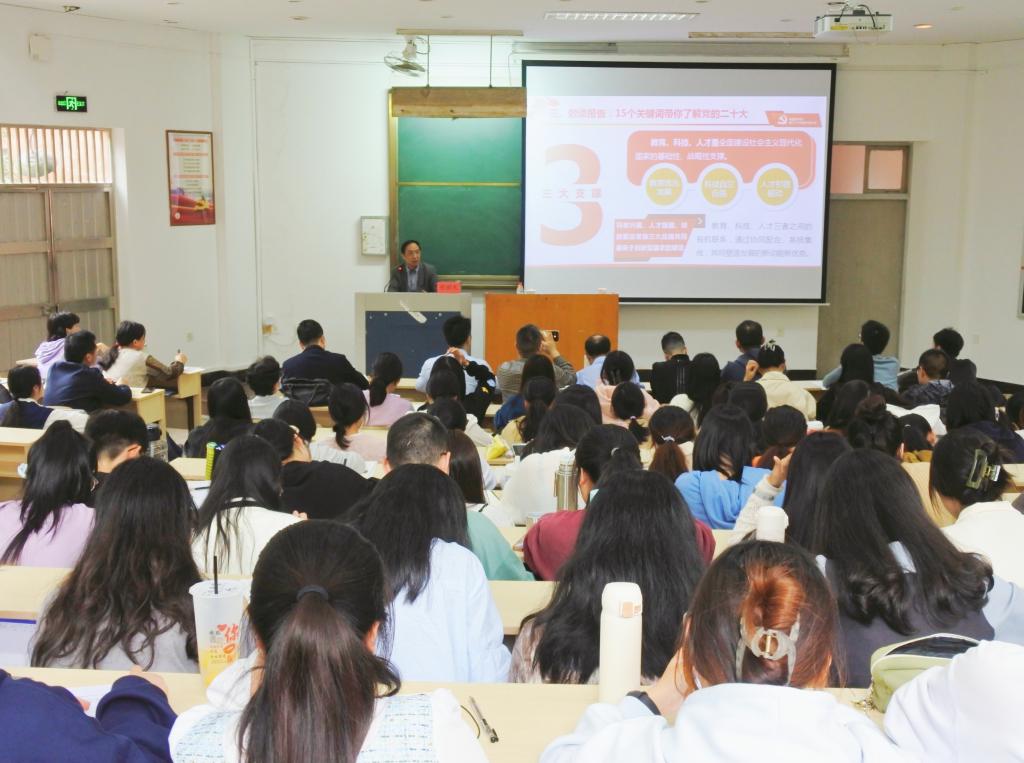 宣讲会从“继往开来:处于关键历史关口的一次重要大会”“数读报告:15个关键词带你了解党的二十大”“伟大变革:过去五年工作情况和新时代十年成就”“擘画蓝图:以中国式现代化全面推进中华民族伟大复兴”四个方面展开阐述。胡韶光说,党的二十大是在全党全国各族人民迈上全面建设社会主义现代化国家新征程、向第二个百年奋斗目标进军的关键时刻召开的一次十分重要的大会,科学谋划未来5年乃至更长时期党和国家事业发展的目标任务和大政方针。“实践没有止境,理论创新也没有止境。马克思主义是我们立党立国、兴党兴国的根本指导思想。”他以脱贫攻坚、科技发展等鲜活案例强调了五年的工作情况和新时代十年成就的伟大变革。最后,胡韶光强调中国式现代化锚定的是人民对美好生活的向往,物质富足、精神富有是社会主义现代化的根本要求。他介绍了互联网时代下中国的发展,希望同学们抓住时代发展的脉搏,把个人职业发展与互联网进行融合,以中国式现代化全面推进中华民族伟大复兴。