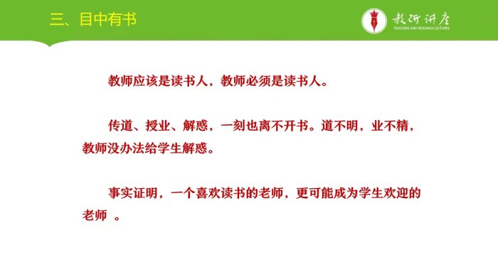 在目中有书和笔下有文方面,裴老师表示教师必须是读书人,阅读要深、要宽、要高。不仅要读透语文教学专业的书籍,还要广泛阅读,力争博览群书。在阅读经典的同时,也要养成记录、写作的习惯。