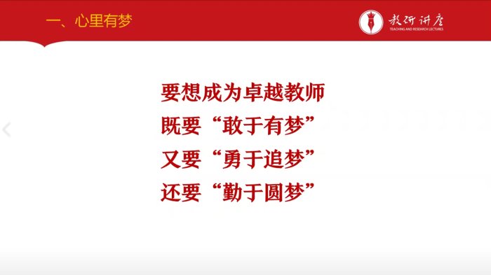 讲座伊始,裴海安老师以一个针对性问题——“普通教师能否通过努力成为卓越教师?”为引,提出青年教师即使起点低,但是只要心中有梦、足底有路、目中有书、笔下有文,就足以成就卓越。何为心中有梦?裴老师以两位卓越名师的成长历程为例,激励同学们敢于有梦,勇于追梦,勤于圆梦。就如其中的余映潮老师,即便一开始学历低、条件差、起步晚,但他迎难而上,将长期规划划分为短期目标;勤奋学习,对中学语文名师细致分类并作研究记录,最终成为了令人尊敬的名师。