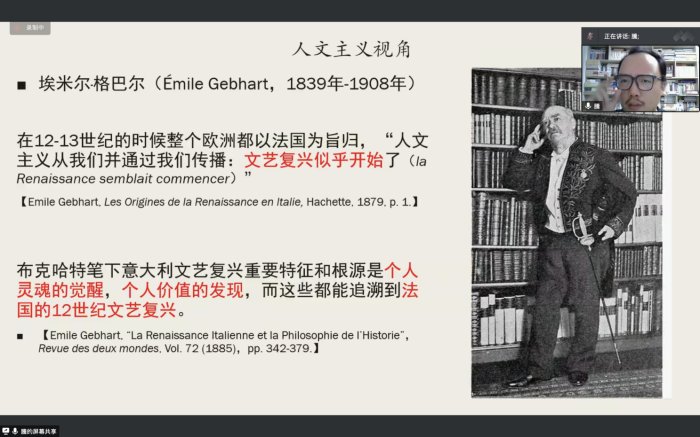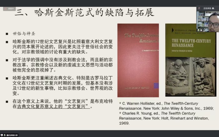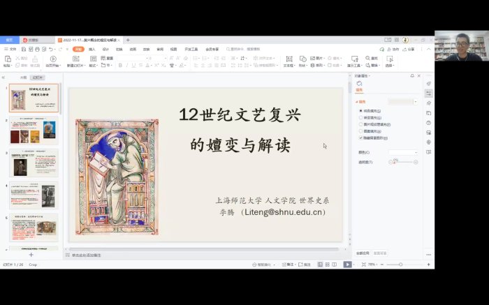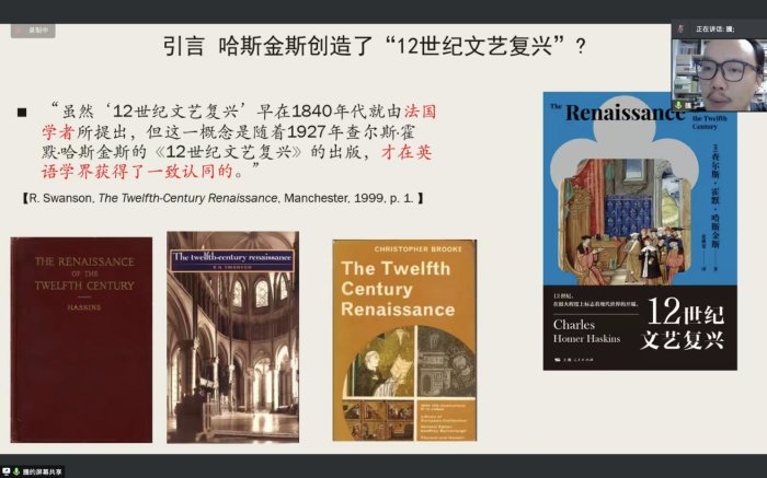 2022年11月24日18:30,台州学院亚洲成人久久“三台史学”讲坛第21期在腾讯会议举行。本期由上海师范大学世界史系副教授、硕士生导师李腾老师主讲,题为“12世纪文艺复兴的学术发展史”。讲座由台州学院亚洲成人久久历史学系程利伟老师主持,吸引了校内外近两百多名师生参与了此次讲座。