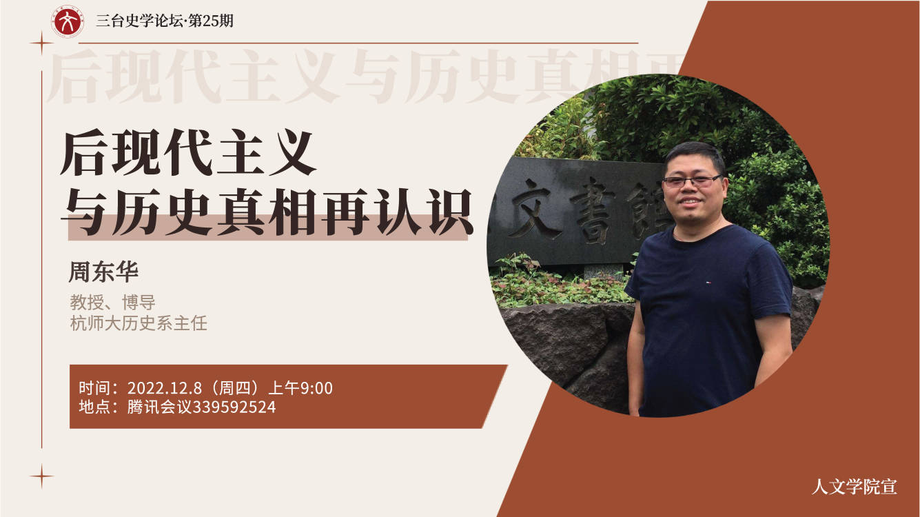 12月8日上午,台州学院亚洲成人久久“三台史学”讲坛第25期在腾讯会议线上举行。本次讲座题为“后现实主义与历史真相的再认识”,由杭州师范大学历史学系主任周东华教授主讲,亚洲成人久久政史系副主任 张燕老师主持,吸引了近百名校内外师生聆听。
