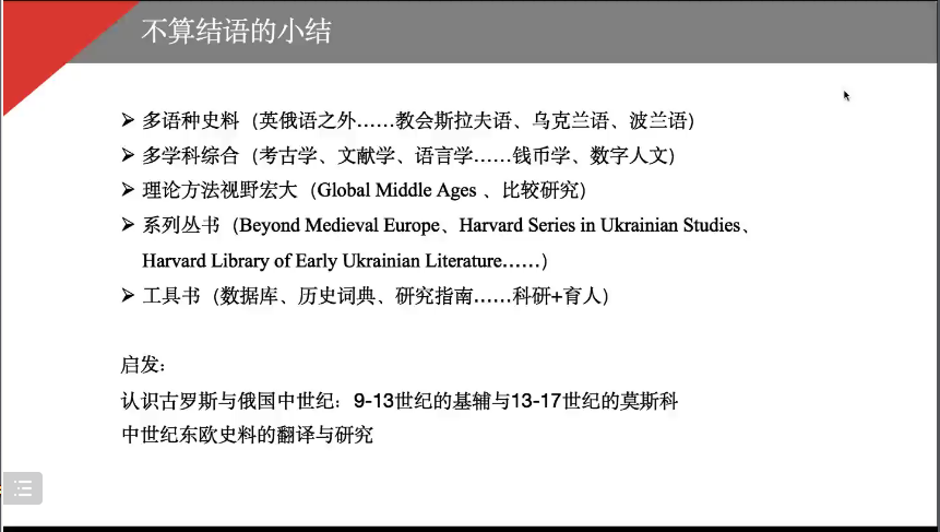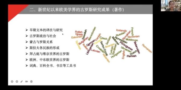 最后,周老师简要总结了新世纪以来欧美学界、更多是英语学界关于古罗斯的研究成果呈现如下特点:一是多语种史料的使用,例如古罗斯研究除了需要吸收英语、俄语成果外,更需要教会斯拉夫语、乌克兰语、波兰语、希腊语和拉丁语等一手史料的使用;二是跨学科的综合,欧美学界擅长考古学、文献学、语言学、钱币学与数字人文等方法的交叉运用;三是宏大的理论视野和方法,比如“全球中世纪”的视野、比较与并置的方法等;四是大量系列丛书的出现,例如Beyond Medieval Europe,Harvard Series in Ukrainian Studies,Harvard Library of Early Ukrainian Literature等;五是工具书丰富,例如数据库、历史辞书、研究指南等。同时也存在一些值得思考的问题,如欧美学界现今积极将9-13世纪的基辅罗斯纳入广泛的欧洲世界,但往往将13-17世纪的莫斯科公国置之门外,这或许也是欧洲中心论的另一种表现。