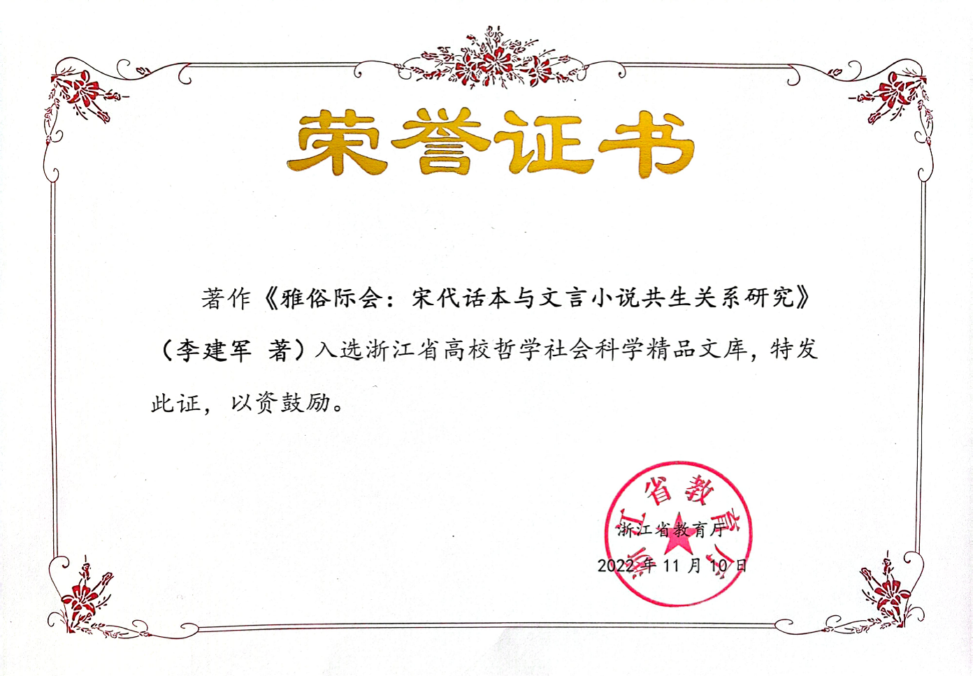浙江省教育厅日前公布了首批浙江省高校哲学社会科学精品文库名单,我校李建军教授专著《雅俗际会:宋代话本与文言小说共生关系研究》成功入选。