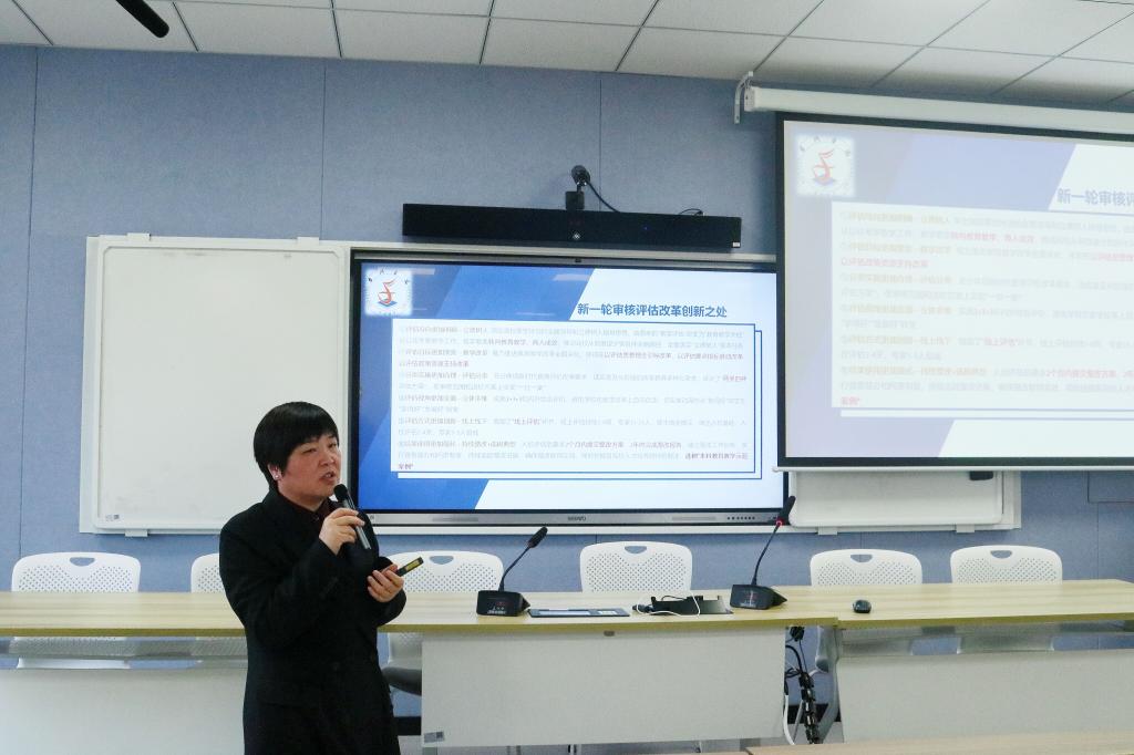 会议伊始,金处长先从新时代新使命、高等教育新要求、地方本科高校新作为、新一轮审核评估要点解读四个方面梳理了重点,然后围绕2018年教育大会习近平总书记提出的“九个坚持”“六个下功夫”,深刻解读了教育部的各种政策。此外,她还分享了联合国教科文组织关于教育的报告中提到的五大建议:第一,教学法应围绕合作、协作和团结等原则加以组织;第二,课程应该注重生态、跨文化和跨学科的学习;第三,教学应该进一步专业化;第四,学校应该承载支持、包容、公平以及个人和集体健康的职责,以便更好地推动世界向公正、公平和可持续发展转变;第五,每一个人都终身享有并扩大在不同的文化和社会空间中接受教育的机会。