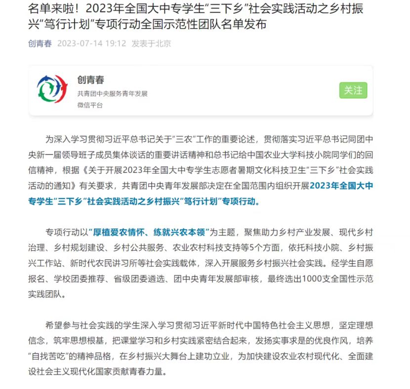 日前,2023年全国大中专学生“三下乡”社会实践活动之乡村振兴“笃行计划”专项行动全国示范性团队名单揭晓。经团队报名、校团委推荐、团省委遴选、团中央青年发展部审核,最终1000支全国性示范实践团队脱颖而出,我校家园守望暑期社会实践团队成功入选。