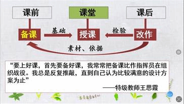 讲座围绕教学工作的“课前”、“课堂”和“课后”三个环节而展开,内容包括“备课的内容与要求”、“课例分享”、“教案编写”、“板书设计”和“作业批改”五个部分。潘虹琴老师就这五个部分讲述和分享了自己在教学工作中的体会与经验。