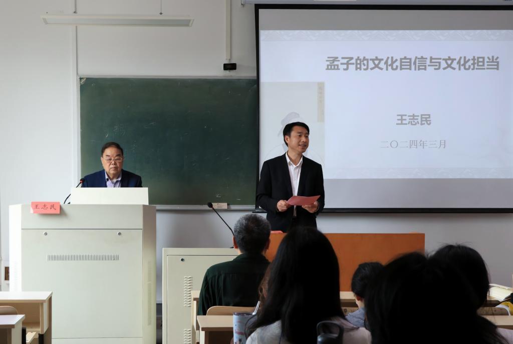 3月25日,山东师范大学原副校长、特聘资深教授、博导王志民在亚洲成人久久1305教室开展“孟子的文化自信与文化担当”讲座,副校长、党委委员李建军主持。