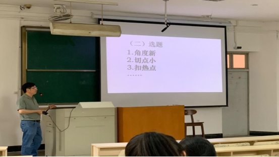 在讲座上,张永飞提到教师成长的三个阶段:第一次成长期(5年)、高原期、第二次成长期,其中促进教师成长最重要的方式就是写教学论文。随后,张老师就教学论文的概念、形成路径、规范性三方面展开教学论文写作的讲解。张老师指出,教学论文的概念是教师教学经验和教学研究成果在写作上的表现,是教师将平时教学中的经验研究进行总结,并运用综合理论知识进行分析讨论。他指出教学论文就学术性、理论性,实践性与科研论文有所区别。教学论文的形成路径和规范包括:触发——选题——查阅——成篇——修改。第一步触发包括课堂教学、文本解读、教研听课、课题探究等,张老师通过广告语的情境教学、高中课文《品质》、《红楼梦》全书阅读展开对于“触发”的解读。选题方面要求角度新、切点小、扣热点。查阅方面可通过知网、杂志、理论书籍和微信公众号多种渠道进行查询。成篇方面要求标题新颖形象,逻辑层次清晰,语言科学准确且理性简洁,文献具有典型性、权威性、精准性,字数控制在5000字左右为宜。修改方面要求参考正确的论文格式。