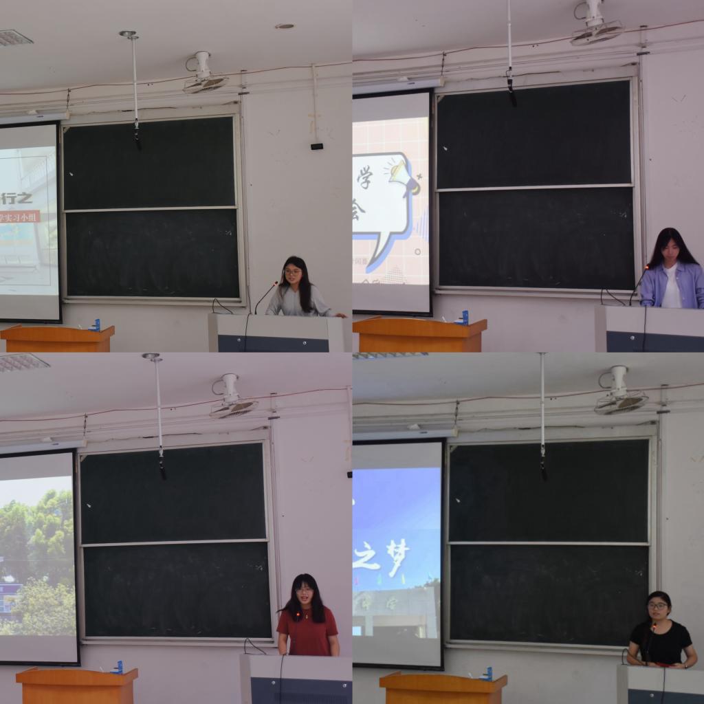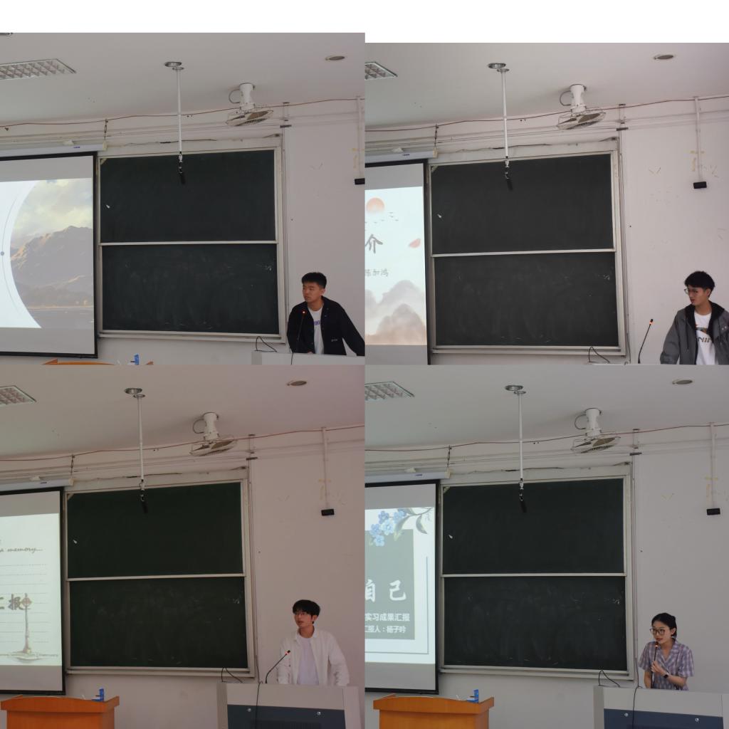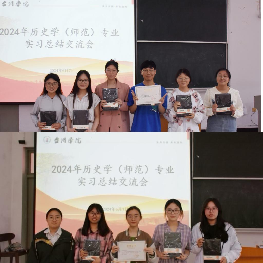 八位实习小组代表依次上台展示实习成果。八位实习代表大致围绕学校介绍、日常生活、日常工作以及经验分享四大板块进行汇报。其中,台州市附属中学实习代表从承道启师途、实践获真知和立志而奋发三方面分享该组在实习过程中的收获。她特别强调,要成为一名好教师,需要真正热爱自己的学生,有心、有爱、有策略地培养他们。随后,椒江五中的实习代表结合自己的实习经历,就教学工作和班级管理两方面提供了三点经验。一是授课过程中要注意用词和重难点把握,二是要积极和指导老师讨论自己的上课情况,三是进入教室的首要任务应是迅速清点学生人数,确保每位学生都按时到课。随后的六个实习小组先后呈现实习过程中的所见、所闻和所学,向22和23级的历史专业学生后续实习提供参考。