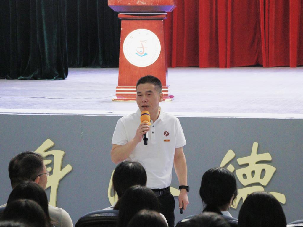 随后,院党委书记陈灵强以《生命有向度,梦想终绽放》为题,为新生上“开学第一堂思政课”。他介绍了497位24级新生的具体情况,并从深厚的文化底蕴与独特的城市精神出发详细介绍了台州。围绕大学教育这个话题,陈灵强强调,同学们在大学要学会自主学习和自我认知,把学习当作理想与追求,养成良好的学习习惯,真正做到德业兼备、身心健康。