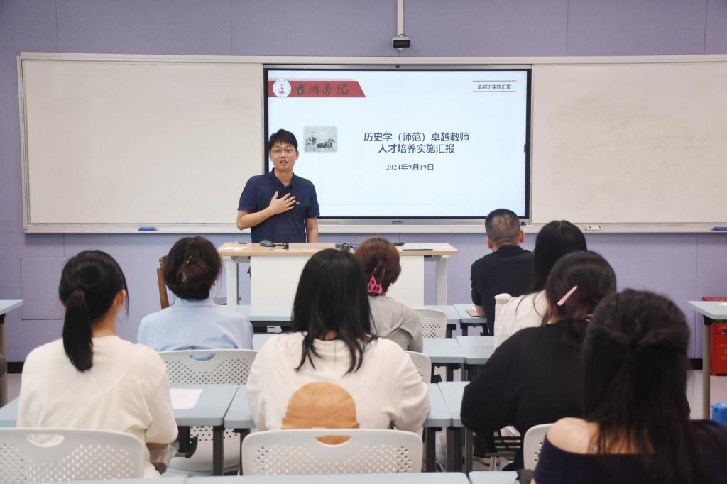 历史系主任苏卢健介绍历史卓越班人才培养实施方案。他首先说明了卓越班成班初衷,即教育部重视卓越教师培养和地方急缺教研型历史教师。接着,他向与会师生介绍了卓越班特色与十大行动计划,如:“一制一化四抓手”的培养模式,实践管理创新行动、多元导师创新行动等,并对同学们提出了不同阶段的预期目标。