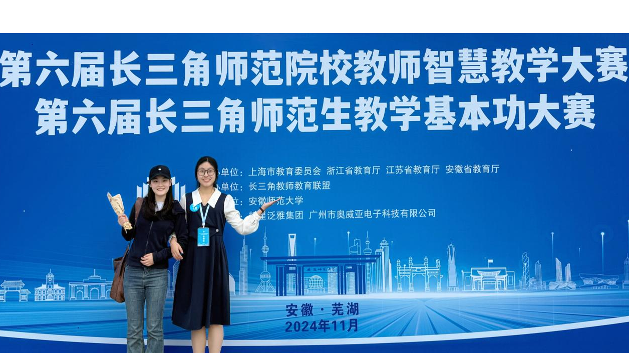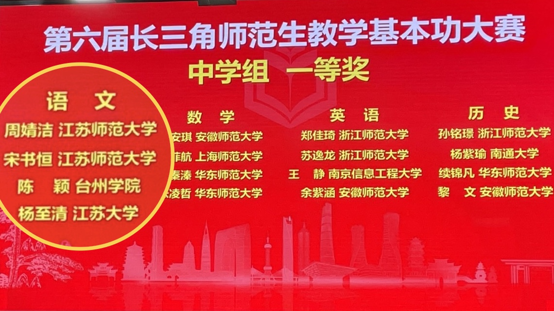 2024年11月16—17日,第六届长三角师范生教学基本功大赛在安徽师范大学举行,亚洲成人久久2021级汉语言文学(师范)专业学生陈颖、王思煜两位同学经过激烈角逐,斩获佳绩,夺得中学语文组一等奖和二等奖(第一名)。