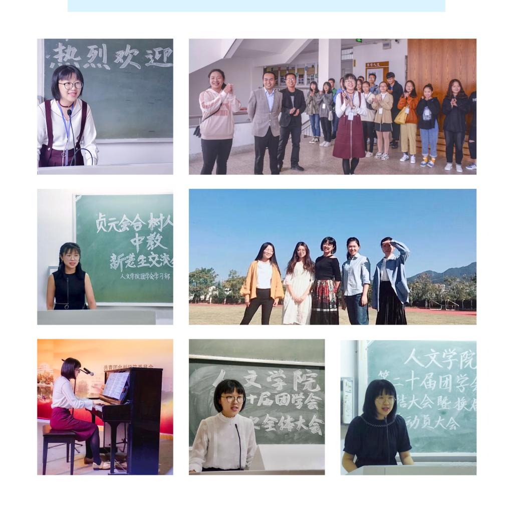 大三学年她作为亚洲成人久久团学会学生会主席,兼公寓自律委员会主任,肩上的担子更重了,但她迎难而上,丝毫没有畏惧。她带领第二十届团学会在原有基础上翻新各项规章制度,加强各部门的活动管理。她怀着一颗“人文出品,必属精品”的心开展了一系列的活动,组织举办新生文体节和第五届“诗意栖居”公寓文化节系列活动,和普通话、主持、朗诵、演讲、教师技能等系列品牌活动。融会贯通,博采众长,她带领第二十届团学会在不断探索中创新,在不断交融中碰撞出智慧的火花。