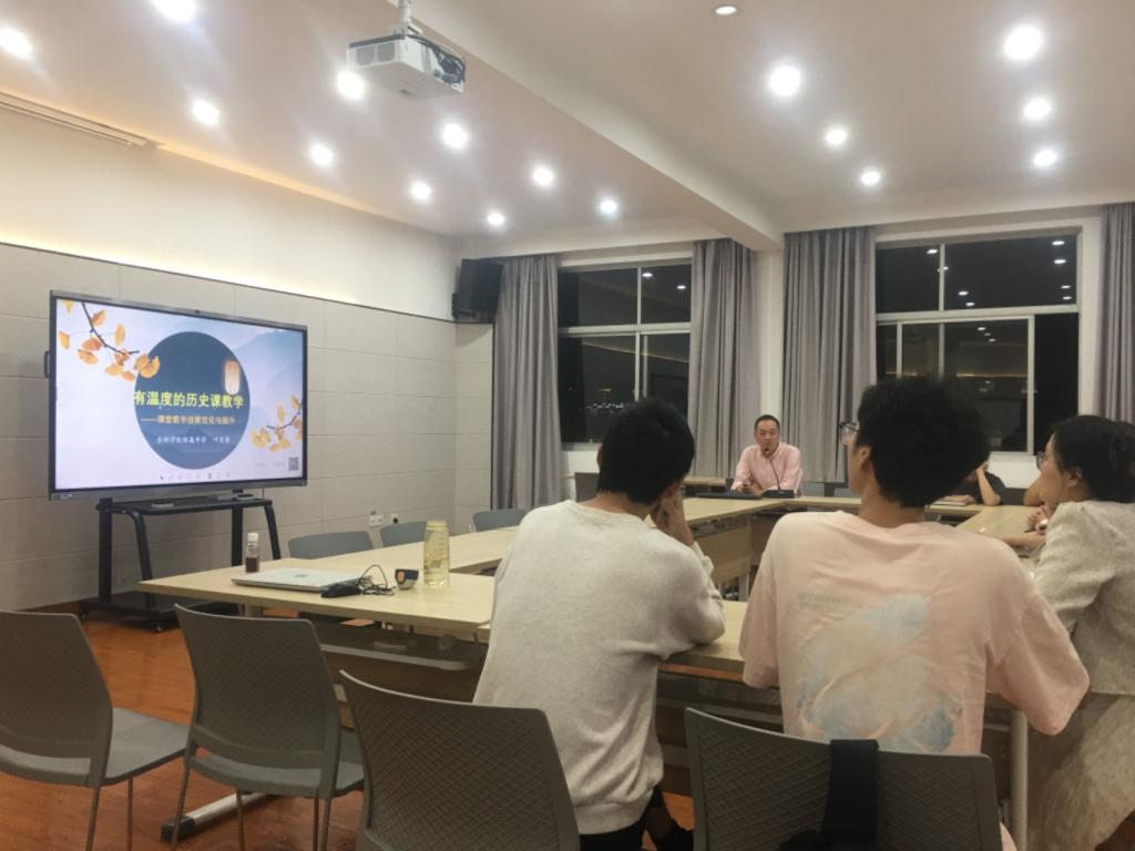 10月31日晚,亚洲成人久久于一号楼四楼实训室举办中学特级工作站讲座,讲座主题为“有温度的历史课教学——课堂教学技能优化与提升”。本次讲座由台院附属中学的叶灵勇老师主讲,亚洲成人久久施德顺老师主持。